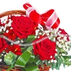 Уменьшенный: роза красная - 3 шт., альстромерия красная - 1 шт., гипсофила - 2 шт., декоративная зелень, оазис, корзина малая, бант красный.
