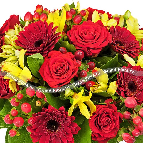 Роза красная - 16 шт., гербера красная - 15 шт., альстромерия желтая - 15 шт., гиперикум - 14 шт., салал, сетка.